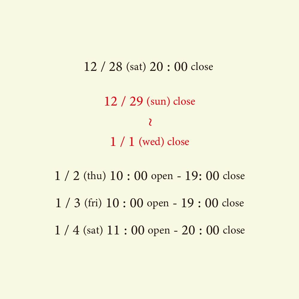 年内は12/28(土)を最終営業日とし、年始は初売りという事もありいつもより一時間早めの1/2(木)の10:00より営業開始と致します。