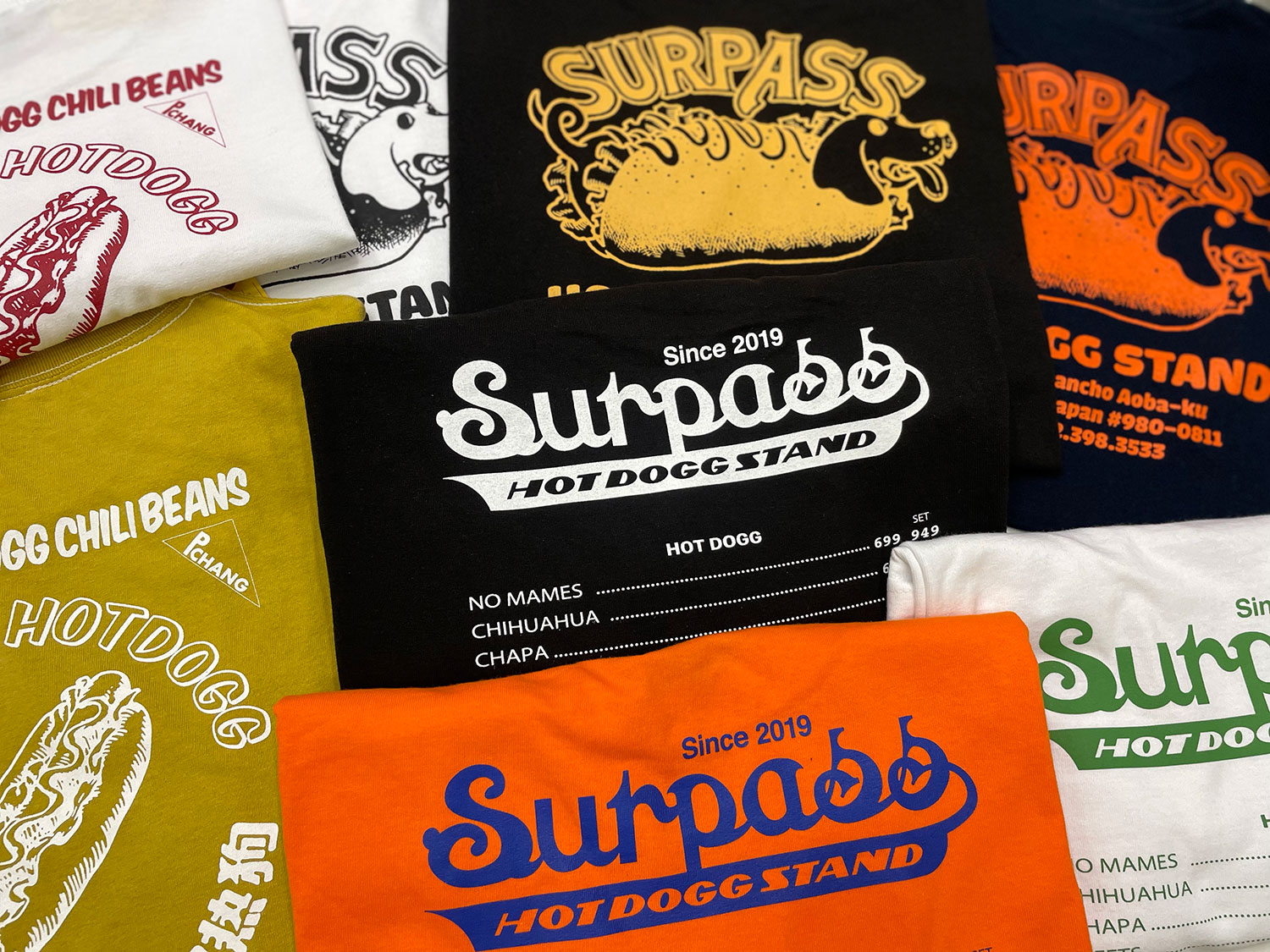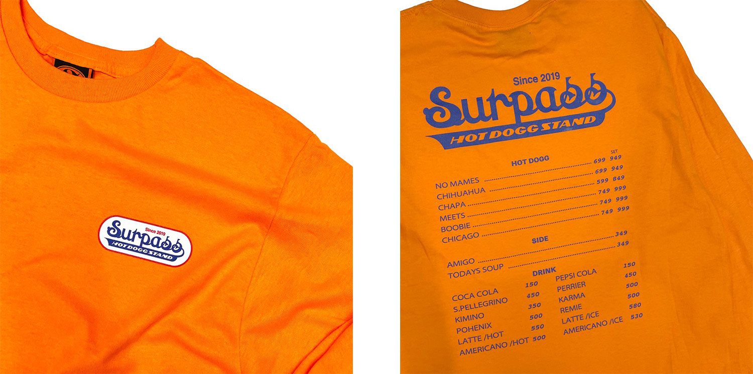P氏…このプリントは見慣れている方も多いと思います。現在の『Surpass Hotdogg Stand』のメニューをそのままバックプリントにしました。