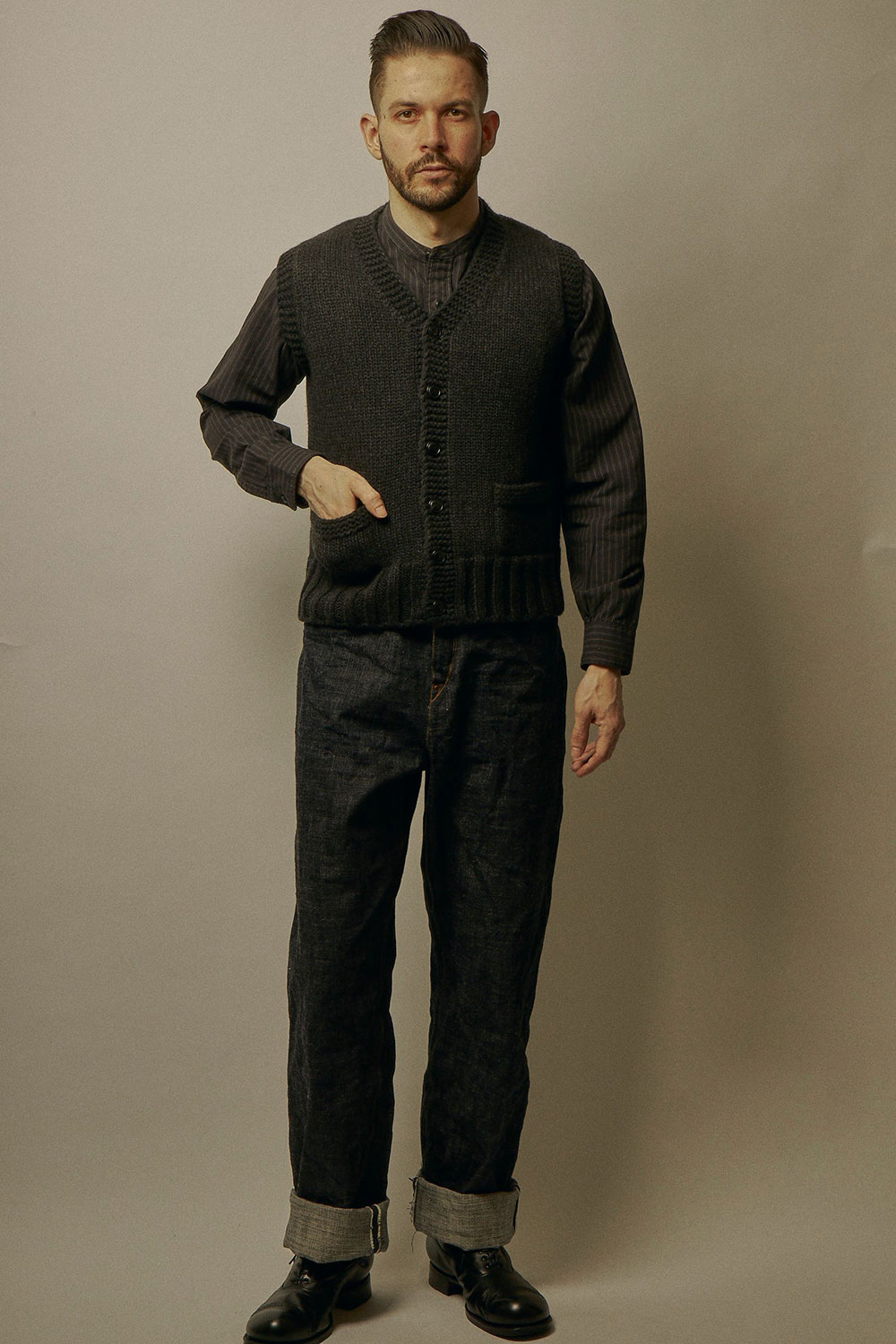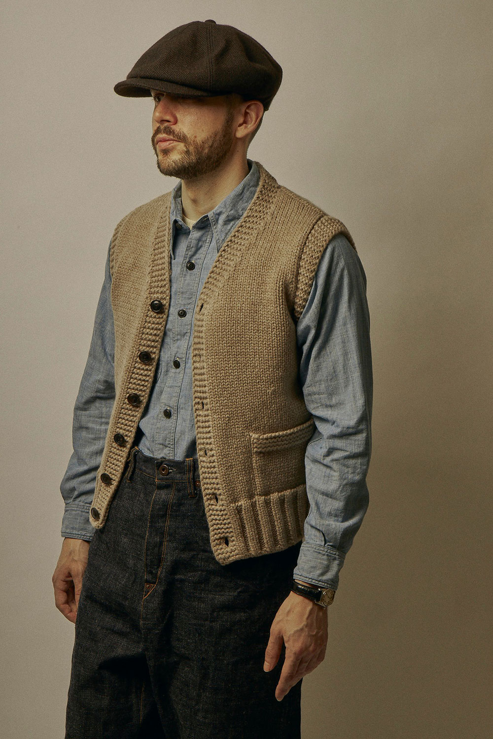 カーディガン同様に肉厚なニットベスト。ベージュ、チャコールの二色展開です。
