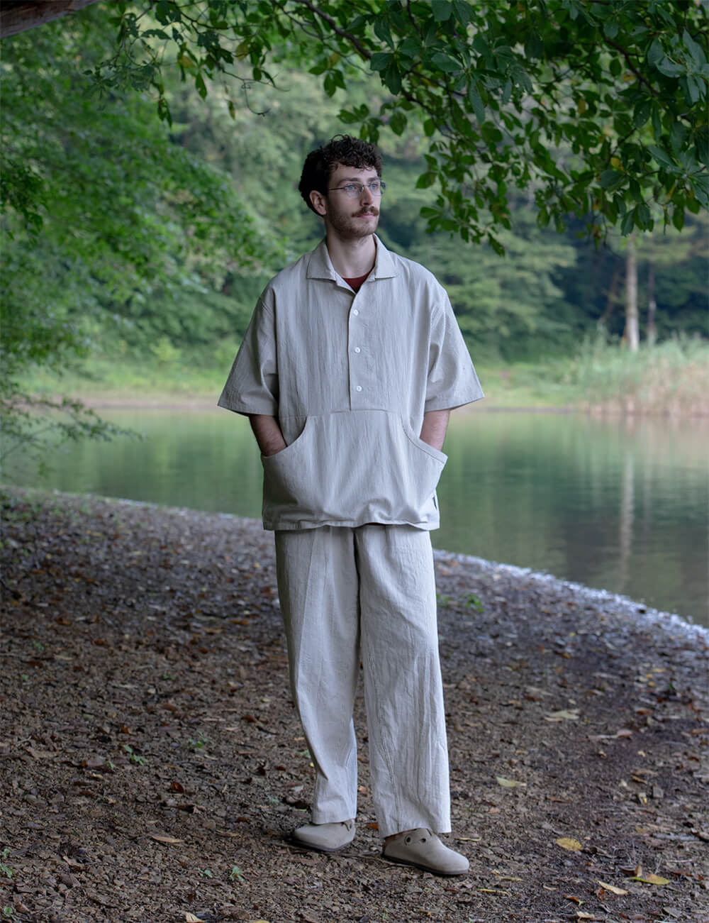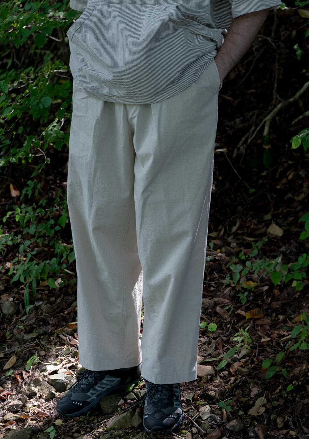 NOROLLの定番アイテムThickwalk Pants。コットン100%で作っていた前回作から、生地を綿麻に変更した新作です。これまで通りポケットなどのディテールは変わらないが、生地感が変わったことで、これまで以上にゆったり感が増して履き心地も良い1本になっています。