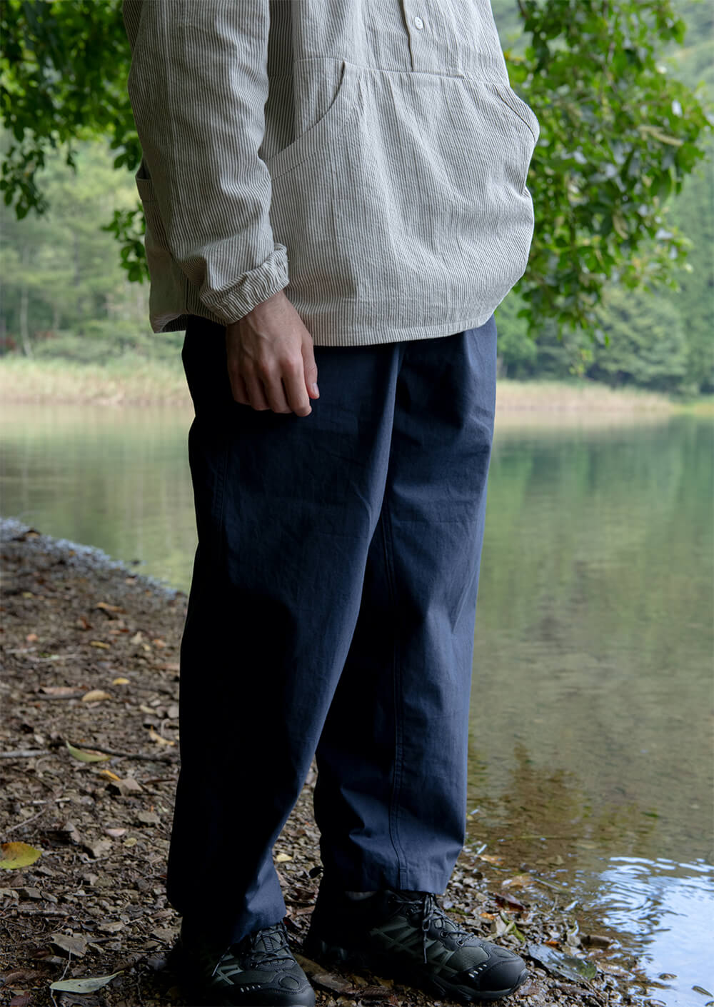 上記のカラー違い。綿麻素材はインドのオーガニックコットンとリネンの混紡糸を使っており、実物を触ると、ザラっとした表面のドライな触り心地。春から夏、暑くなる季節にも、心地良く履くことが出来るそんなパンツです。