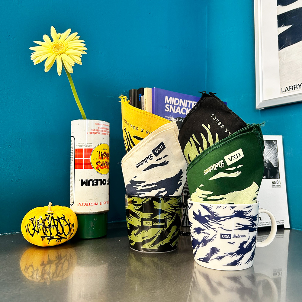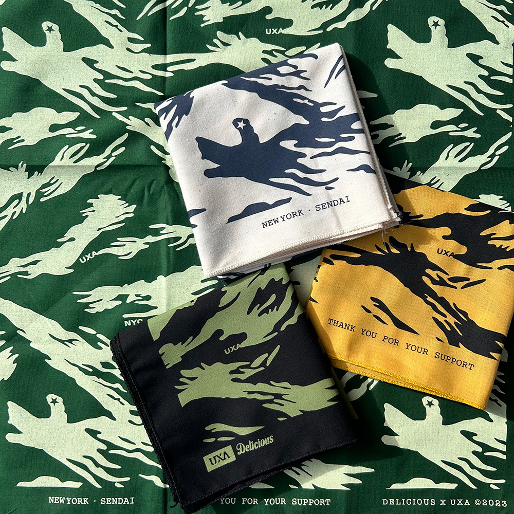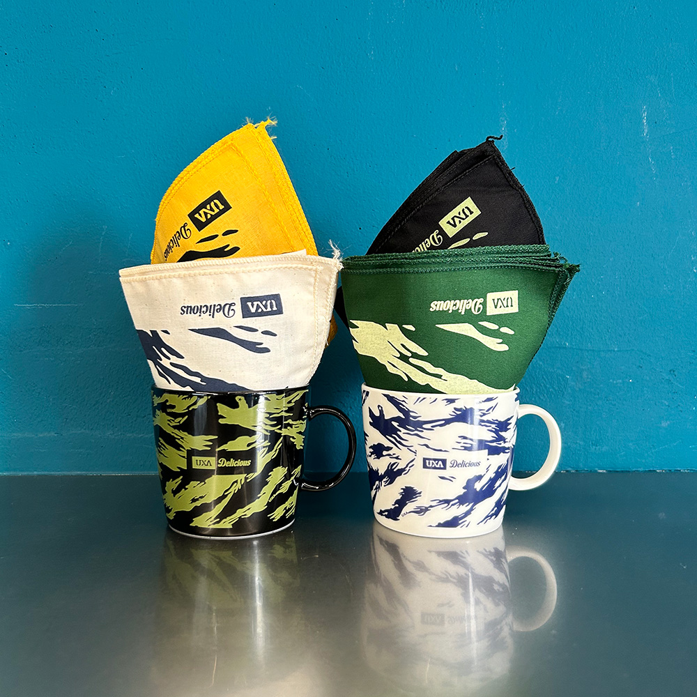 今年は、UXAとコラボレーションしたデザインのマグカップ2種類とバンダナ4種類をご用意。
