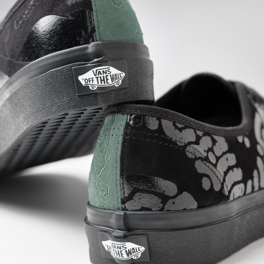 シューズのパネルごとに各アーティストのデザインが描かれており、さらにはインとアウトサイドでカーキとブラックで切り替えることで、インパクトある仕上がりに。