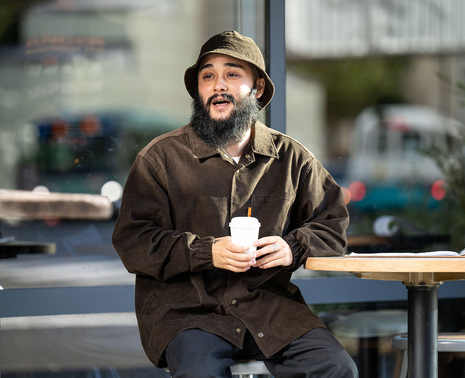 P氏…このシャツジャケットは、春にDeliciousでリリースしたシャツジャケットをベースに形をデザインしました。生地は以前にリリースしたハットと同じ、格子状のコーデュロイを使っています。